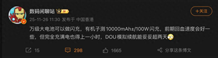 博主还提到,即便是上了100W闪充,要充满万级大电池也要1个小时以上。但得益于电池够大,在日均使用时长DOU的模拟续航下,可以至少2天1充。根据博主暗号,这款手机预计是小米或者REDMI新机。