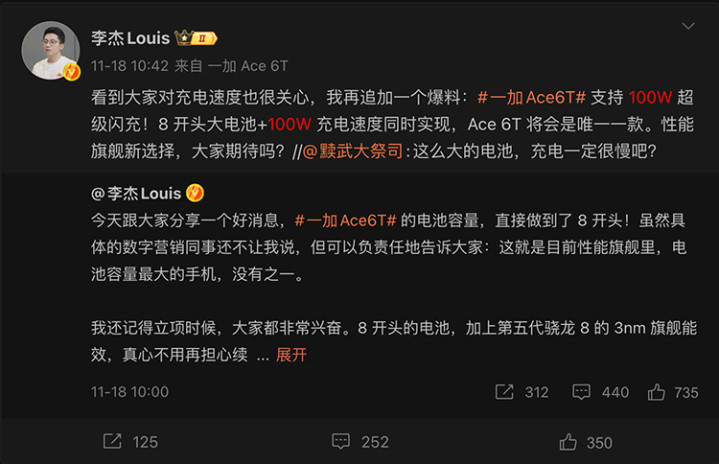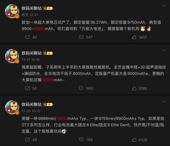 目前量产的手机都已经来到8000mAh水平,前天刚发布的荣耀500系列,以及之前的红魔11 Pro是80W快充;iQOO Z10 Turbo+激进一点,是90W快充,目前8开头电池相对就保守一点,还没有100W快充的。不过即将发布的一加ACE 6T,将出现8开头大电池和100W快充的组合。