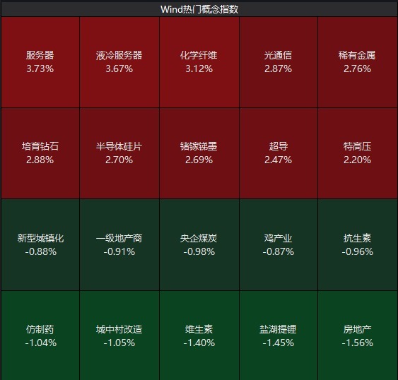 服务器、化学纤维、液冷服务器、超硬材料、稀有金属、电子元器件等概念涨幅居前。地产、电工电网、能源设备、零售、生物科技、酒类等概念跌幅居前。